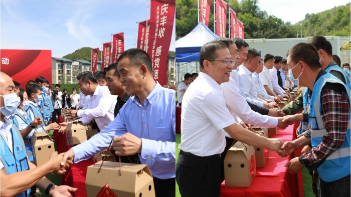 慰問活動(dòng)現(xiàn)場(chǎng),與會(huì)領(lǐng)導(dǎo)為農(nóng)民工朋友們發(fā)放慰問品,并隨后觀看了“慶豐收、感黨恩”慰問演出。