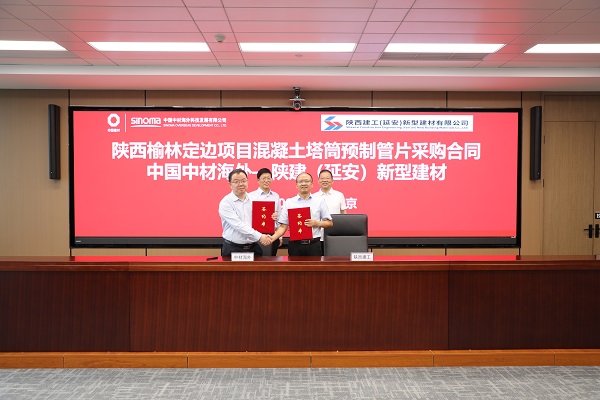 會上,中國中材海外科技發(fā)展有限公司黨委副書記、總經(jīng)理祝林和,集團(tuán)總工程師、新型建材公司董事長王弘起代表雙方簽訂了陜西榆林定邊項目混凝土塔筒預(yù)制管片采購合同。
